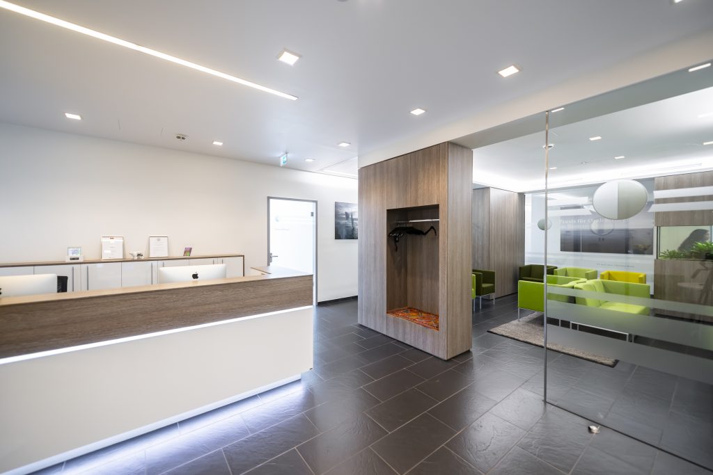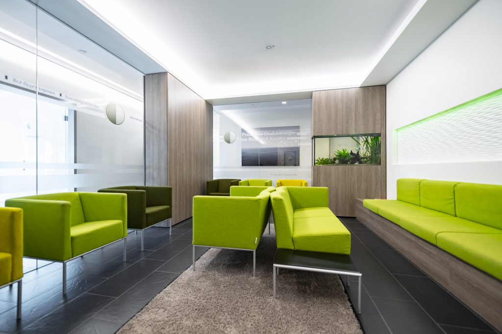 Das Interieur der Praxisräume beeindruckt durch eine klare und frische Gestaltung. Helle Weißtöne dominieren die Räume und sorgen für eine freundliche, offene und hygienische Atmosphäre. Ergänzt werden diese durch dezente grüne Akzente, die eine beruhigende und entspannende Wirkung haben.