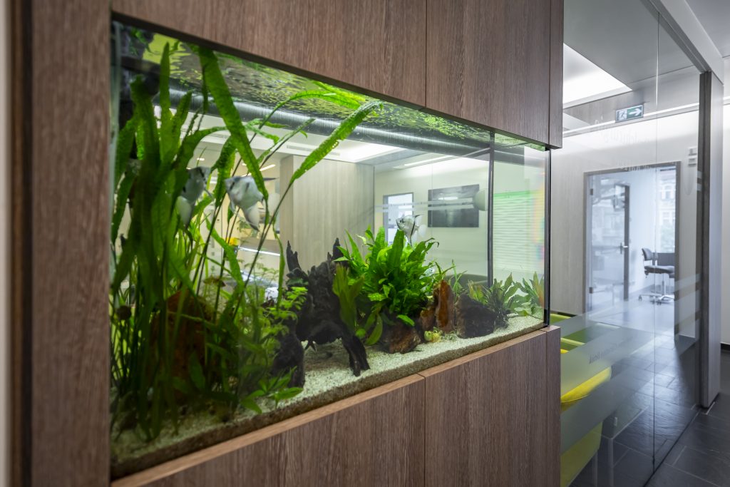 Das Aquarium trägt zur stressfreien und angenehmen Atmosphäre der Praxis bei und unterstreicht die sorgfältige Gestaltung der Räume, die auf das Wohlbefinden der Patienten ausgerichtet ist.